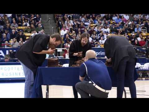 Chocolate Cake Eating Contest - Maglebys Cake - Allison and I competing for a Lifetime of free Maglebys chocolate cake during half time at the BYU Mens basketball game.